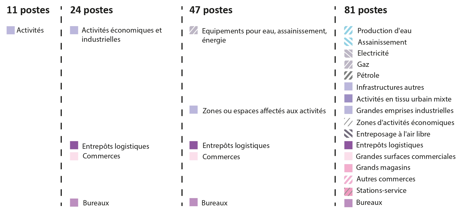 Pour cela, le MOS distingue les espaces agricoles, naturels, forestiers et urbains selon une nomenclature fixe. Ces grandes catégories sont ensuite déclinées en quatre niveaux d’analyse de plus en plus fins : 11, 24, 47 et 81 postes de légende.