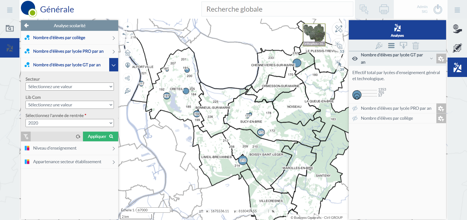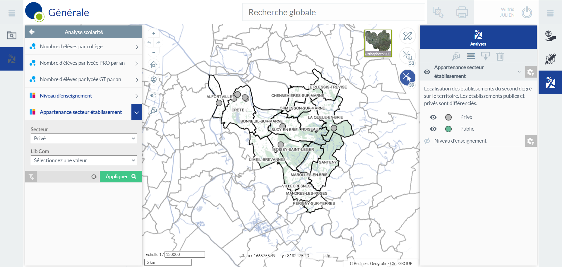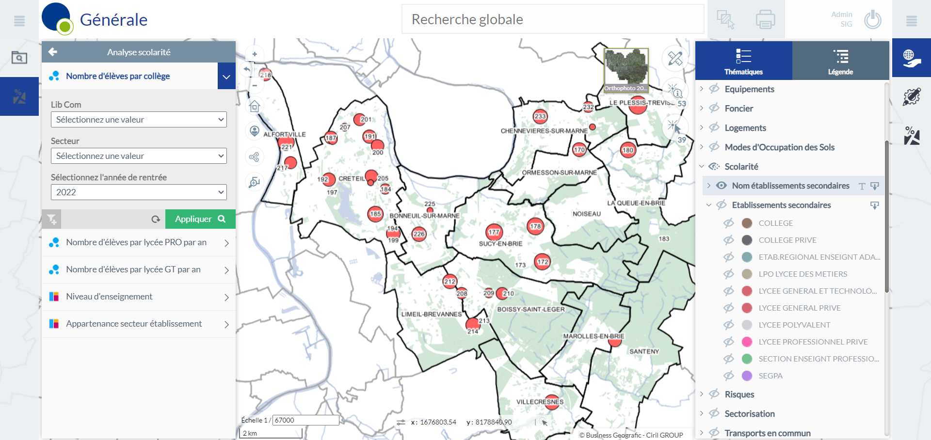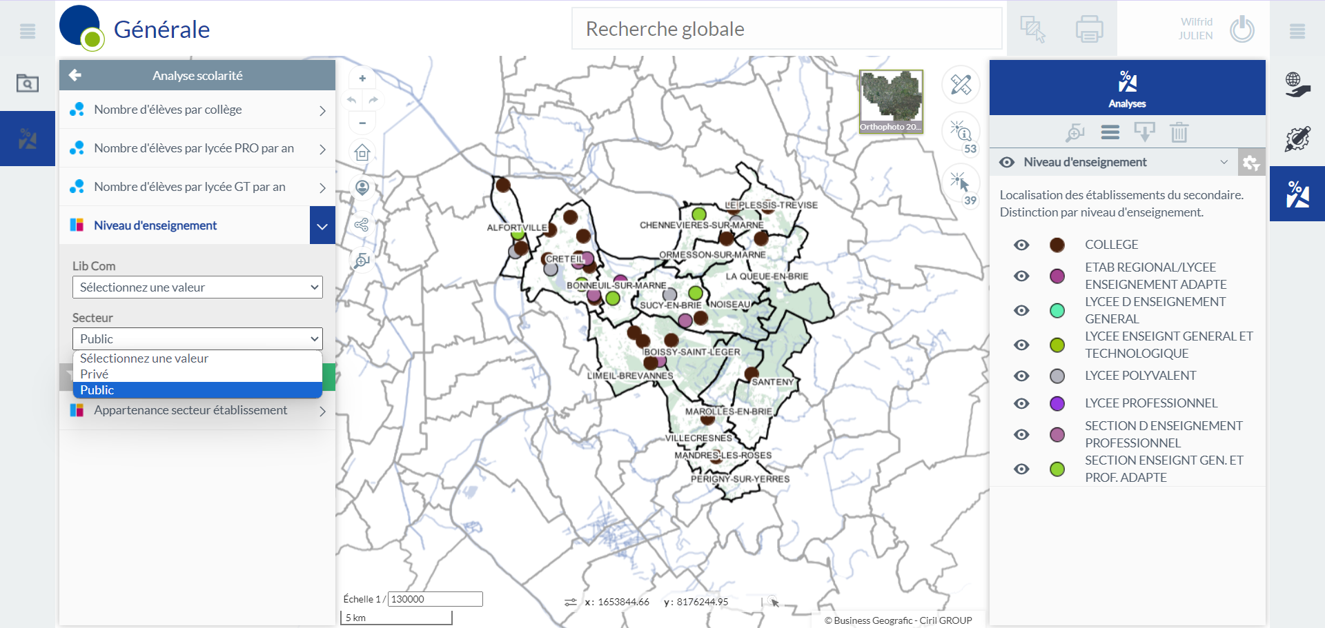 L’analyse Niveau d’enseignement permet de distinguer les établissements du secondaire en fonction du niveau d’enseignement : collège, lycée etc. Le filtre proposé permet de distinguer les établissements en fonction de leur secteur (privé ou public). Il est possible aussi de filtrer sur les communes, si un focus sur la commune de Créteil par exemple, est nécessaire à l’analyse.