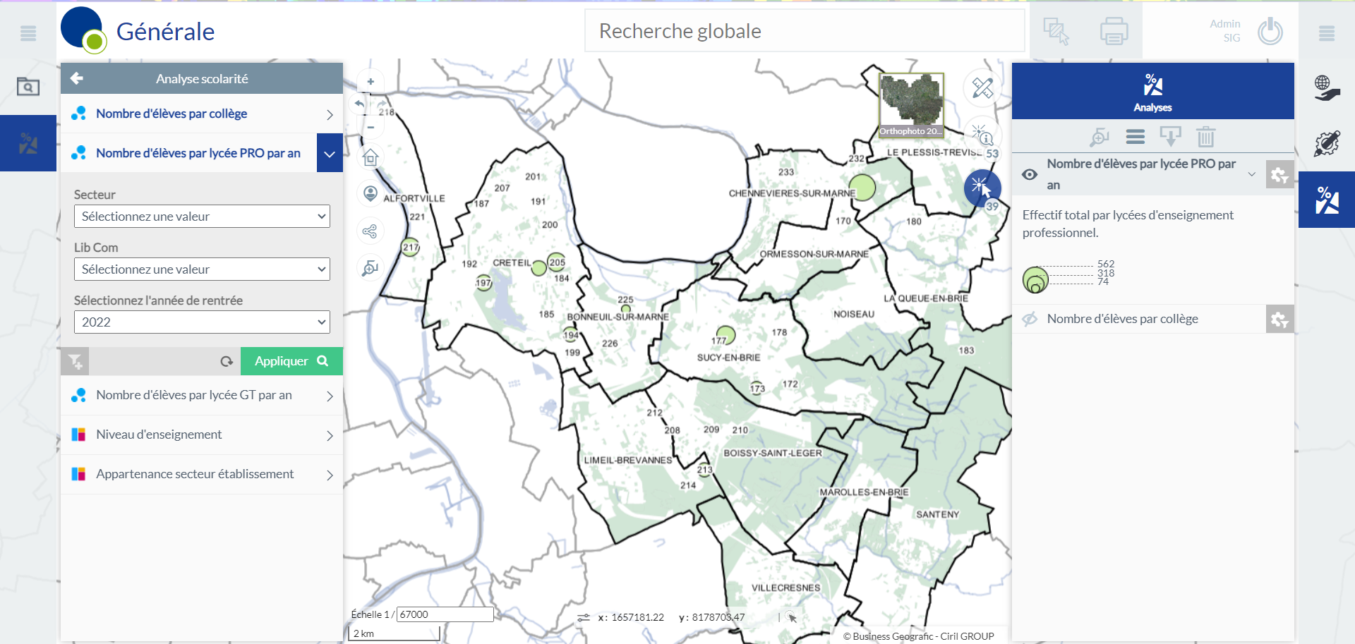 L’analyse Nombre d’élèves par lycée PRO par an vous permet de visualiser cartographiquement le nombre d’élèves par lycée professionnel dans les établissements localisés. Par défaut, GEO vous affichera les effectifs pour les établissements de toutes les communes et tout les secteurs, ainsi que pour toutes les années. Vous pouvez filtrer la commune, le secteur et l’année pour obtenir les résultats souhaités.