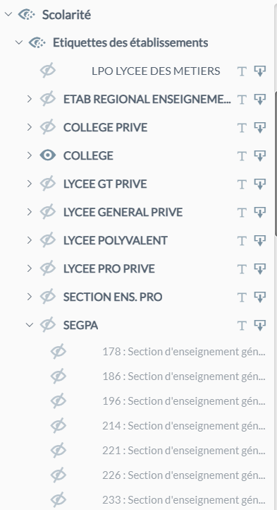 permet de savoir à quel établissement fait référence l’étiquette visible sur la carte. Il est possible d’afficher/masquer les étiquettes que l’on souhaite. Cela impactera directement la légende, au moment de l’export d’une carte éditée sur GEO. Cette couche est divisée en plus catégorie : une pour chaque natu