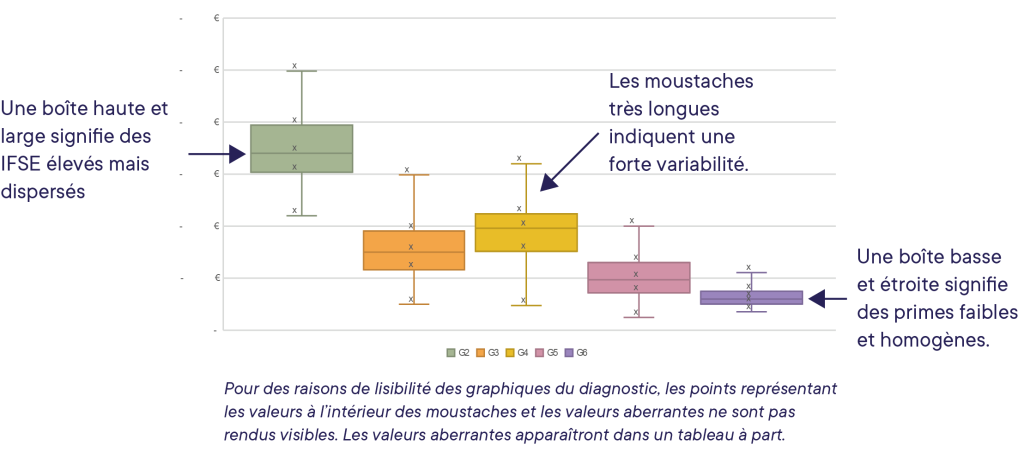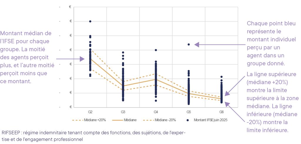 Clé de lecture d’un graphique de la zone médiane : ce graphique montre les montants d’IFSE, répartis par groupe RIFSEEP