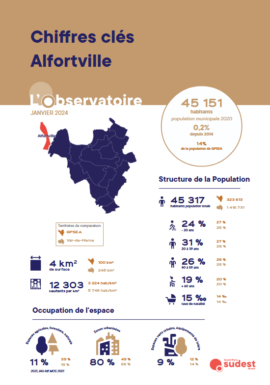 Ce document rassemble les chiffres clés des communes du territoire de Grand Paris Sud Est Avenir (GPSEA), classés par ordre alphabétique et actualisés en janvier 2024. Conçu par la Direction de l’Observatoire à partir des données de l’INSEE et de l’IAU, il offre un panorama détaillé de chaque commune : évolution démographique, structure de la population, occupation de l’espace, logement, emploi, revenus et tissu économique.