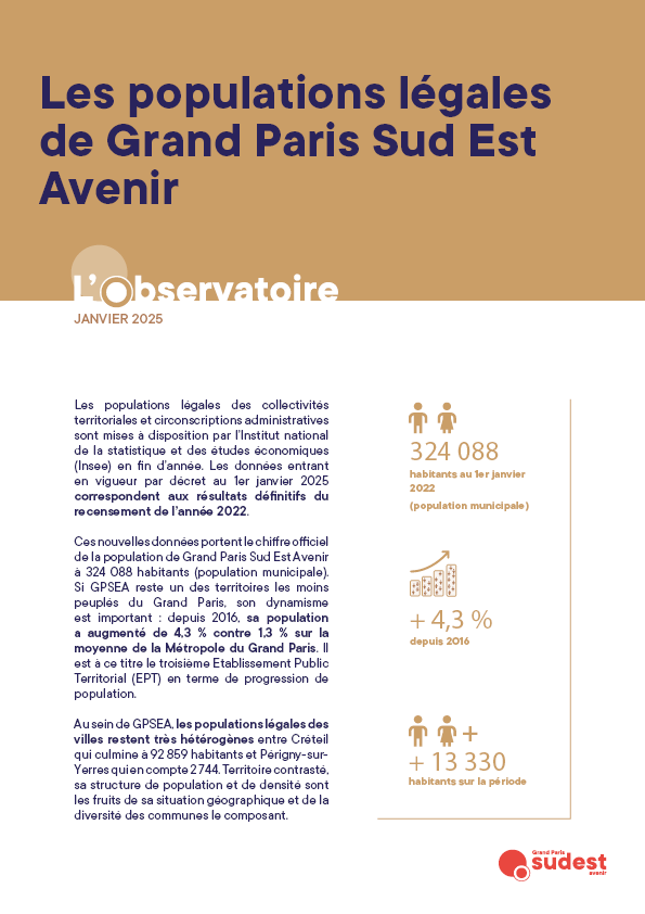 L’Observatoire de Grand Paris Sud Est Avenir a mis à jour son étude sur les populations légales au sein de son territoire, conformément à sa vocation d’éclairer les politiques publiques grâce aux données. A l’image du réveillon, les nouveaux chiffres de population reviennent pour rythmer notre passage dans une nouvelle année. Dans cette première publication de 2025, l’Observatoire de Grand Paris Sud Est Avenir partage les données territoriales et apportent des précisions sur la meilleure manière de les lire et de les comprendre.